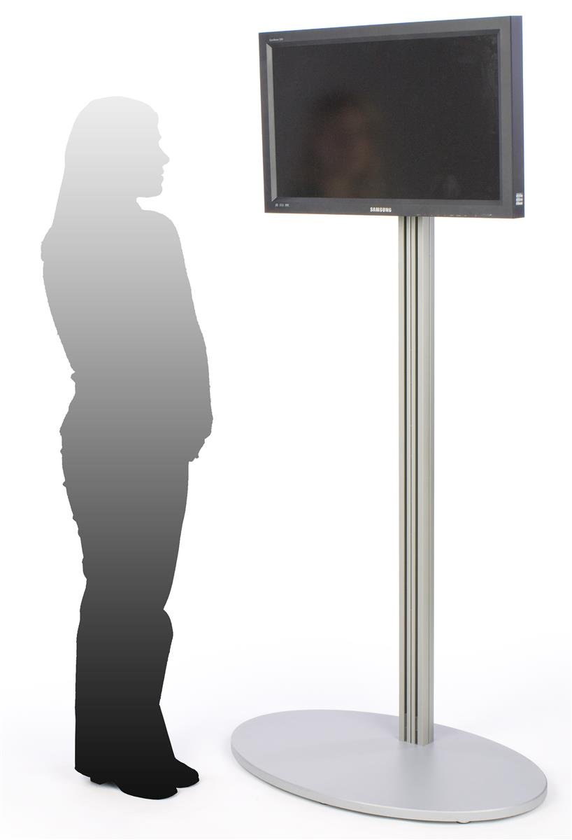 This monitor floor stand is designed to hold a 32 to 60 inch flat panel screen. The LCD TV display fixture is constructed from brushed aluminum, which has a satin silver finish to blend in with any décor. The oval MDF base measures 37.4375 inches wide and provides incredible stability for the 73-inch-tall fixture. This monitor floor stand is equipped with a 200mm by 200mm VESA-compatible bracket for mounting most flat-screen television brands. Please check the dimensions of your TV before placing an order. The monitor floor stand also includes four plastic strips in which a user can store wires. The cables can then be slide through the channels along the backside of the fixture, to keep them out of sight and to prevent them from becoming tangled. The monitor floor stand has a simple style, yet is an affordable tool for incorporating digital advertising into a business or store.